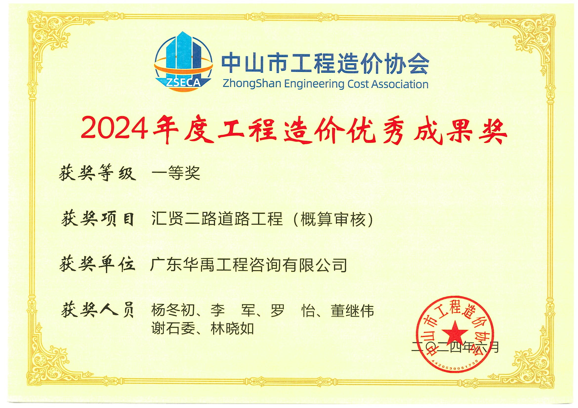 匯賢二路道路工程(概算審核)獲中山市2024年度工程造價(jià)優(yōu)秀成果獎一等獎