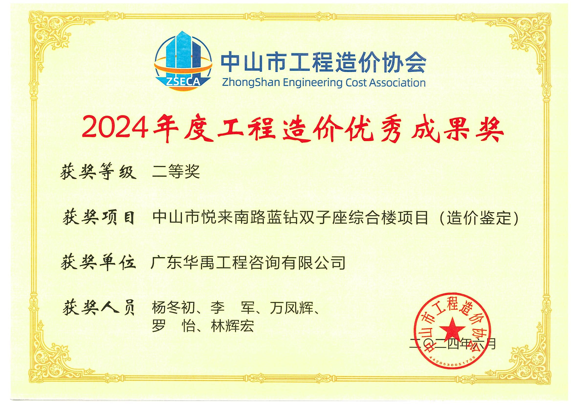 中山市悅來(lái)南路藍鉆雙子座綜合樓項目(造價(jià)鑒定)獲中山市2024年度工程造價(jià)優(yōu)秀成果獎二等獎