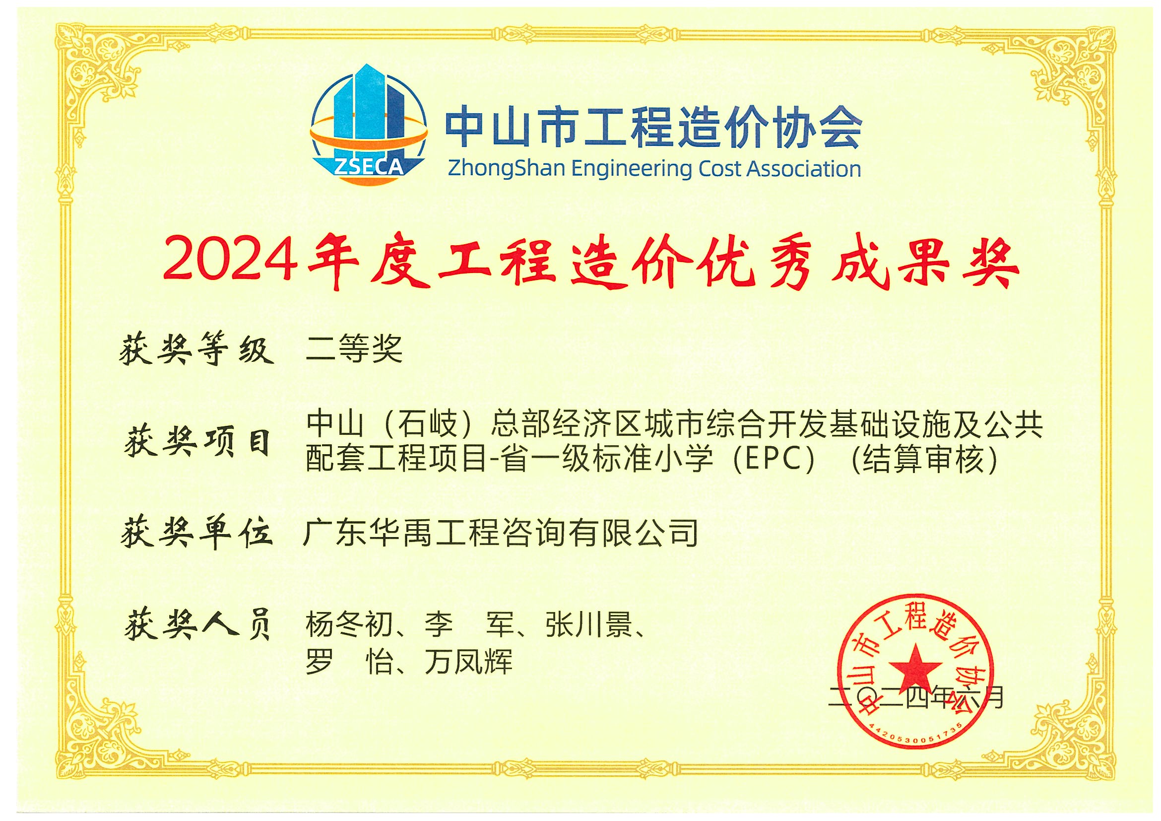 中山(石岐)總部經(jīng)濟區城市綜合開(kāi)發(fā)基礎設施及公共配套工程項目-省一級標準小學(xué)(EPC)(施工結算審核)獲中山市2024年度工程造價(jià)優(yōu)秀成果獎二等獎